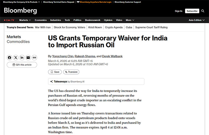 The US has cleared the way for India to temporarily increase its purchases of Russian oil, reversing months of pressure on the world’s third-largest crude importer as an escalating conflict in the Persian Gulf upends energy flows. A license issued