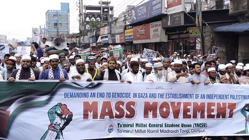 Students from Ta’mirul Millat Kamil Madrasa organized a protest in Tongi condemning the ongoing genocide by Israeli occupying forces in Palestine. The rally began at the madrasa’s main gate and marched through key areas of the Dhaka-Mymensingh Highway, including Ershadnagar, Hossain Market, and College Gate, before concluding with a brief gathering near Asia Petrol Pump.