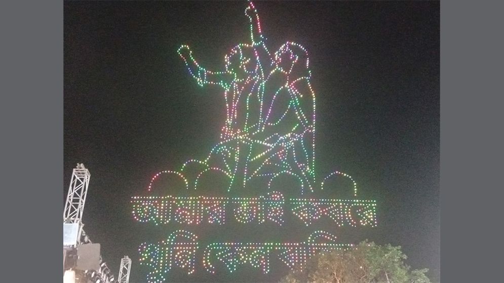 ঘড়ির কাটায় তখন রাত সাড়ে এগারোটা। জুলাই গণ-অভ্যুত্থানের ১৪ জুলাই পুর্নজাগরণের অনুষ্ঠান তখন চলছিল। হঠাৎ কেন্দ্রীয় শহীদ মিনারের পশ্চিম আকাশ থেকে রংবেরঙের আলো জ্বালিয়ে ভেসে আসে ২০০০ ড্রোন।