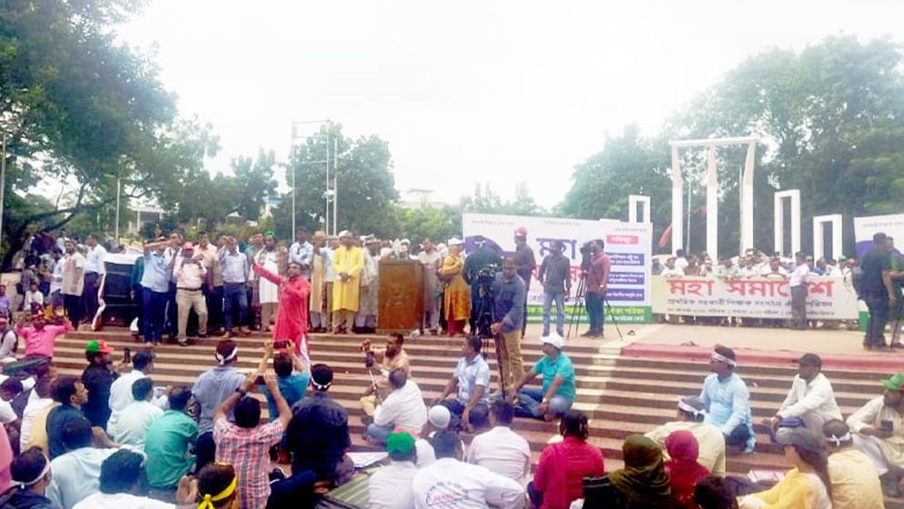 The demands, announced at a grand rally organized by the ‘Assistant Teachers’ Unity Council’ at the Central Shaheed Minar, include: raising entry-level assistant teachers’ salaries to Grade 11, ensuring promotion for all teachers, and resolving complexities in grade advancement after 10 and 16 years of service.