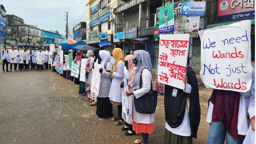Students of Sunamganj Medical College staged protests for the third consecutive day, demanding the immediate opening of the 500-bed hospital affiliated with their college. Although the academic program began in 2020-21, the hospital remains non-operational, forcing students in higher years to attend limited clinical classes twice a week at the district hospital 15 kilometers away. With no dedicated transport, this severely disrupts their education.