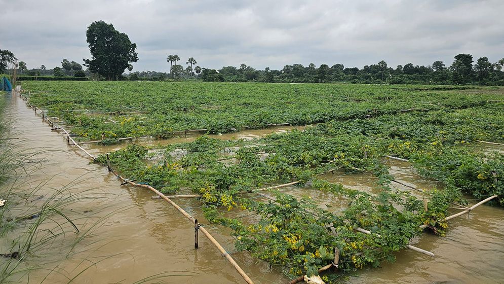Continuous rains and flash floods have submerged thousands of hectares of char land in Comilla’s Gomati River area, destroying farmers’ crops just days before harvest. Despite water levels remaining below the danger mark, rising floodwaters have inundated agricultural fields and homes between embankments, causing heavy losses. Farmers, many already affected by last year’s floods, are struggling to recover as their vegetables and produce lie underwater. Authorities are assessing the damage and seeking government aid for the affected farmers.