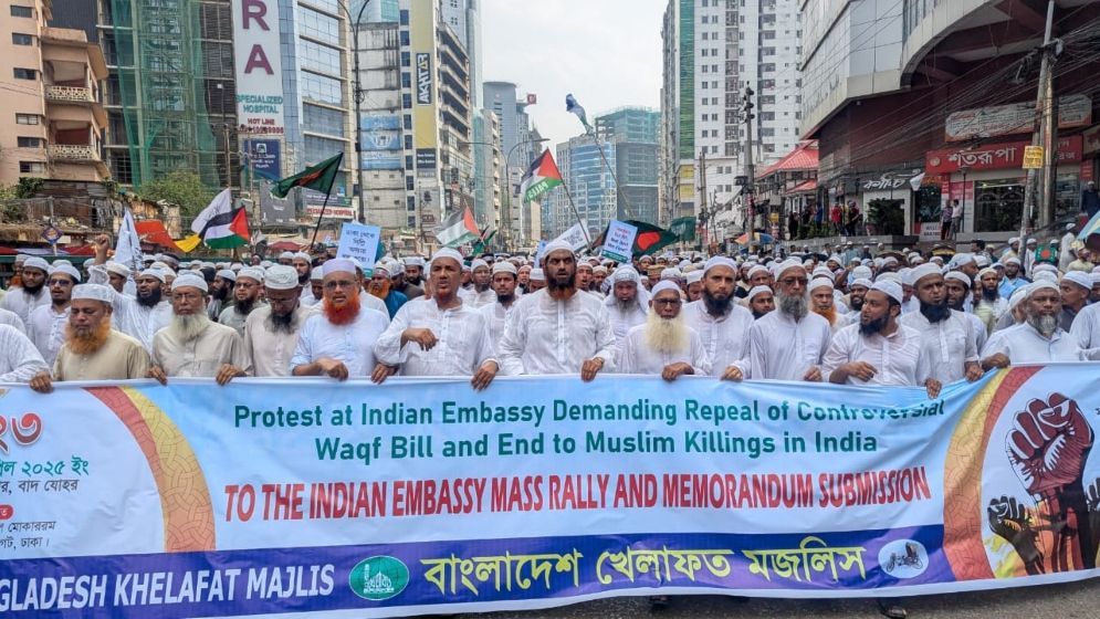 বিতর্কিত ওয়াকফ সংশোধনী বিল বাতিল ও মুসলিম নিধন বন্ধের দাবিতে ভারতীয় দূতাবাস অভিমুখে খেলাফত মজলিসের উদ্যোগে গণমিছিল ও স্মারকলিপি প্রদান কর্মসূচি অনুষ্ঠিত হয়েছে। বুধবার বাদ জোহর জাতীয় মসজিদ বায়তুল মোকাররমের উত্তর পাদদেশ থেকে গণমিছিল শুরু হয়। এতে নেতৃত্ব দেন খেলাফত মজলিসের আমির মাওলানা মামুনুল হক।