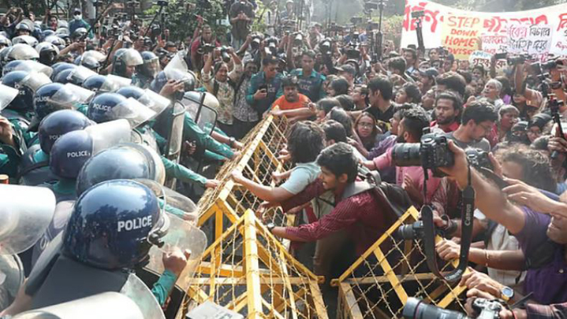 A mass procession towards the Ministry of Home Affairs began on Monday afternoon. The procession started from the Central Shaheed Minar around 2:30 PM, passed through TSC, and moved towards the Ministry of Home Affairs. At around 3:00 PM, law enforcement agencies blocked the protesters in front of the Education Building. There was a scuffle between the police and the students and youth participating in the march. The protesters managed to remove the police blockade. However, they could not proceed further towards the Secretariat due to police resistance. The protesters later sat on the road, chanting slogans.
